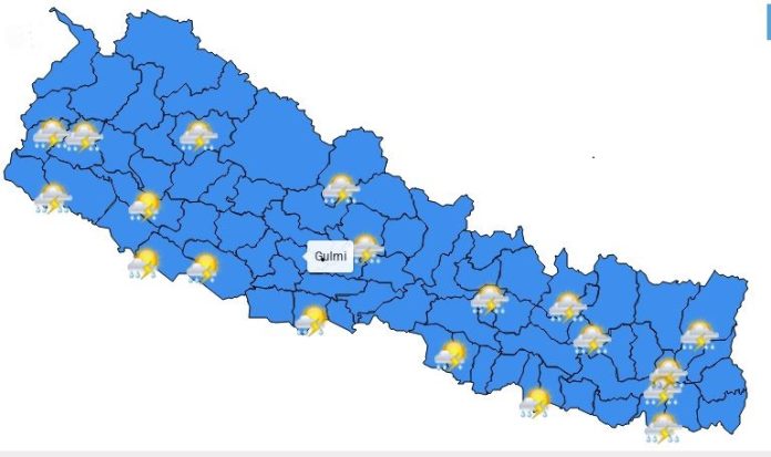 आज राती कोशी प्रदेश, मधेश प्रदेश, बागमती प्रदेश, गण्डकी प्रदेश र लुम्बिनी प्रदेश लगायत देशको पहाडी भूभागमा आंशिक देखि साधारणतया बदली रही बाँकी भूभागमा मुख्यतया सफा देखि आंशिक बदली रहनेछ । कोशी प्रदेश र गण्डकी प्रदेशका थोरै स्थानहरूमा तथा मधेश प्रदेश लगायत बागमती प्रदेश, लुम्बिनी प्रदेश र कर्णाली प्रदेशको पहाडी भूभागका एक दुई स्थानमा मेघगर्जन चट्याङ्ग सहित हल्का देखि मध्यम वर्षाको सम्भावना रहेको छ । कोशी प्रदेश, बागमती प्रदेश र गण्डकी प्रदेशको उच्च पहाडी तथा हिमाली भूभागका एकदुई स्थानमा हल्का वर्षा र हिमपातको सम्भावना रहेको महाशाखाले जनाएको छ।