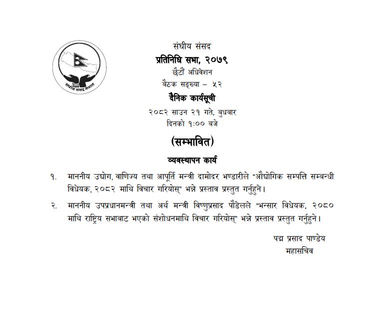 साथै उपप्रधान तथा अर्थ मन्त्री बिष्णुप्रसाद पौडेलले ‘भन्सार बिधेयक, २०८० माथी राष्ट्रियसभावाट भएको संसोधन माथी बिचार गरियोस् ’ भन्ने प्रस्ताव गर्ने सम्भावित कार्यसुची रहेको छ ।